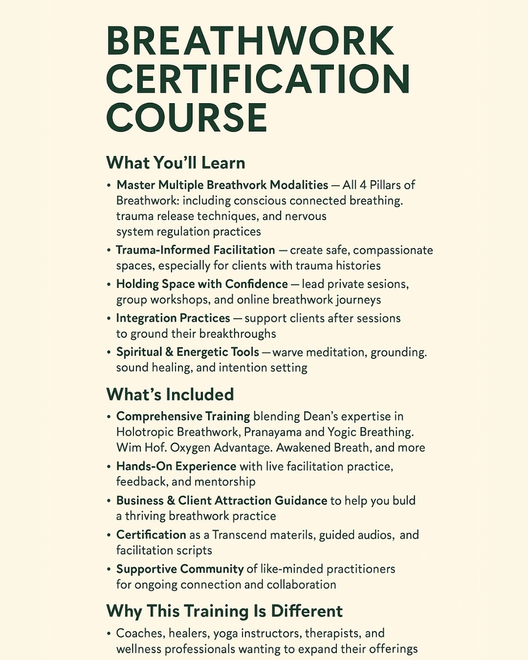 This is more than just a course. It’s a mind-body-soul initiation where you’ll be trained in all four pillars of Breathwork—calming, activating, and dynamic, including trauma-informed modalities like Transformational and Holotropic Breathwork. You’ll not only experience profound healing yourself but also gain the knowledge, confidence, and structure to guide others through powerful breathwork journeys.